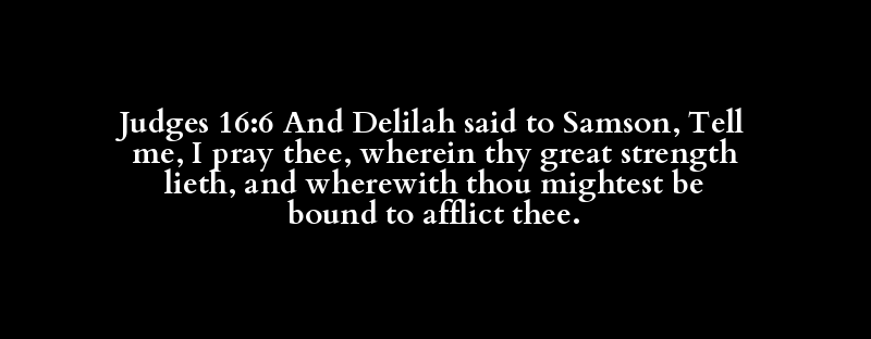 Judges 16:6 And Delilah said to Samson, Tell me, I pray thee, wherein thy great strength lieth, and wherewith thou mightest be bound to afflict thee.