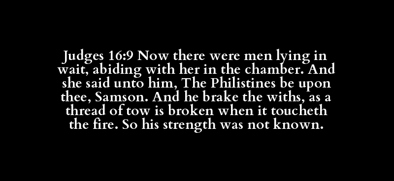 Judges 16:9 Now there were men lying in wait, abiding with her in the chamber. And she said unto him, The Philistines be upon thee, Samson. And he brake the withs, as a thread of tow is broken when it toucheth the fire. So his strength was not known.