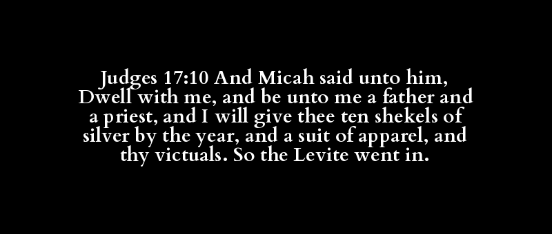 Judges 17:10 And Micah said unto him, Dwell with me, and be unto me a father and a priest, and I will give thee ten shekels of silver by the year, and a suit of apparel, and thy victuals. So the Levite went in.