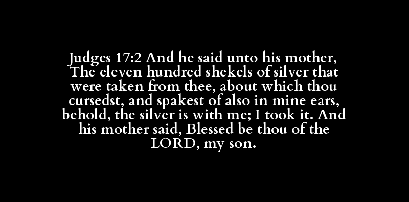 Judges 17:2 And he said unto his mother, The eleven hundred shekels of silver that were taken from thee, about which thou cursedst, and spakest of also in mine ears, behold, the silver is with me; I took it. And his mother said, Blessed be thou of the LORD, my son.
