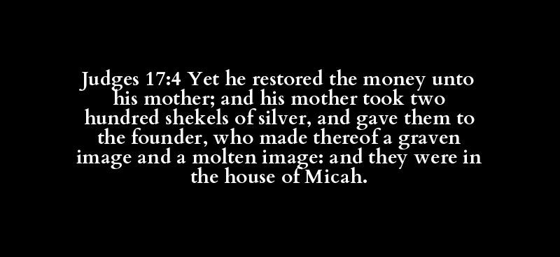 Judges 17:4 Yet he restored the money unto his mother; and his mother took two hundred shekels of silver, and gave them to the founder, who made thereof a graven image and a molten image: and they were in the house of Micah.