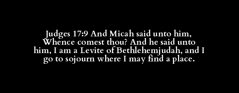 Judges 17:9 And Micah said unto him, Whence comest thou? And he said unto him, I am a Levite of Bethlehemjudah, and I go to sojourn where I may find a place.
