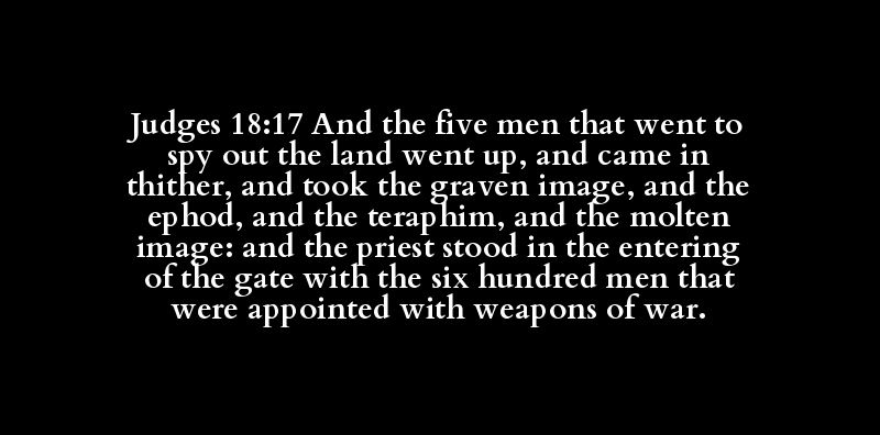 Judges 18:17 And the five men that went to spy out the land went up, and came in thither, and took the graven image, and the ephod, and the teraphim, and the molten image: and the priest stood in the entering of the gate with the six hundred men that were appointed with weapons of war.
