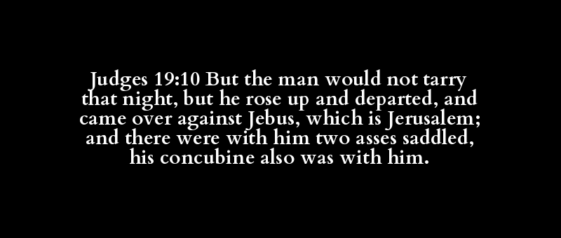 Judges 19:10 But the man would not tarry that night, but he rose up and departed, and came over against Jebus, which is Jerusalem; and there were with him two asses saddled, his concubine also was with him.