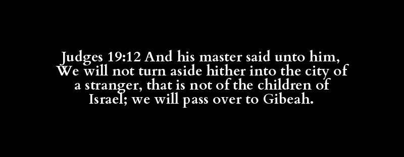 Judges 19:12 And his master said unto him, We will not turn aside hither into the city of a stranger, that is not of the children of Israel; we will pass over to Gibeah.
