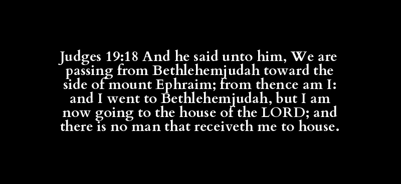 Judges 19:18 And he said unto him, We are passing from Bethlehemjudah toward the side of mount Ephraim; from thence am I: and I went to Bethlehemjudah, but I am now going to the house of the LORD; and there is no man that receiveth me to house.