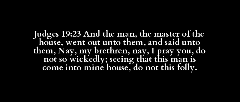 Judges 19:23 And the man, the master of the house, went out unto them, and said unto them, Nay, my brethren, nay, I pray you, do not so wickedly; seeing that this man is come into mine house, do not this folly.