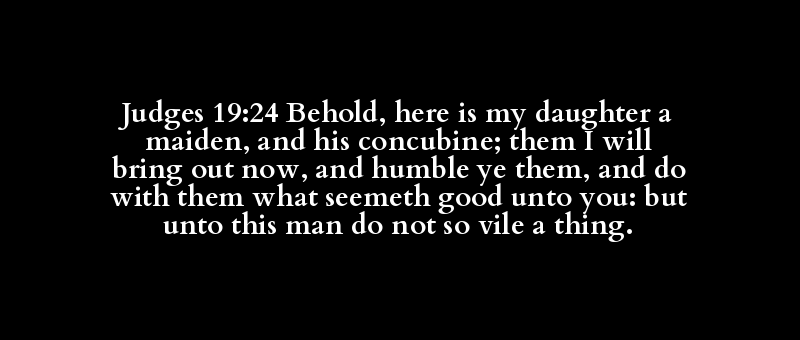 Judges 19:24 Behold, here is my daughter a maiden, and his concubine; them I will bring out now, and humble ye them, and do with them what seemeth good unto you: but unto this man do not so vile a thing.