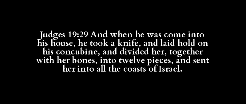 Judges 19:29 And when he was come into his house, he took a knife, and laid hold on his concubine, and divided her, together with her bones, into twelve pieces, and sent her into all the coasts of Israel.