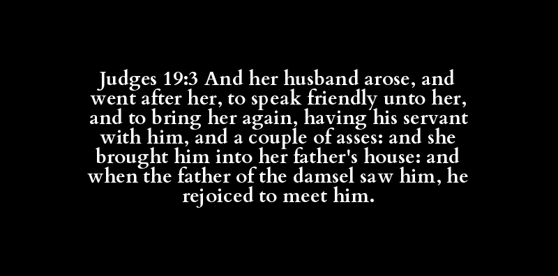 Judges 19:3 And her husband arose, and went after her, to speak friendly unto her, and to bring her again, having his servant with him, and a couple of asses: and she brought him into her father's house: and when the father of the damsel saw him, he rejoiced to meet him.