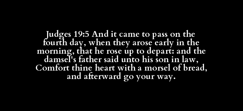 Judges 19:5 And it came to pass on the fourth day, when they arose early in the morning, that he rose up to depart: and the damsel's father said unto his son in law, Comfort thine heart with a morsel of bread, and afterward go your way.