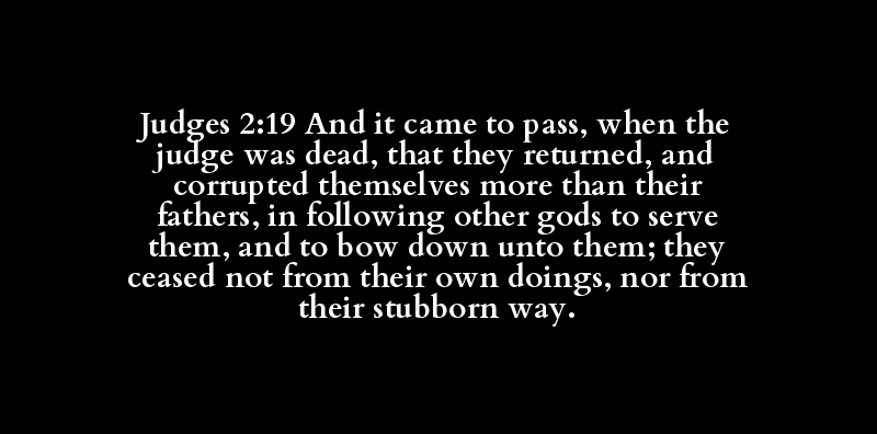 Judges 2:19 And it came to pass, when the judge was dead, that they returned, and corrupted themselves more than their fathers, in following other gods to serve them, and to bow down unto them; they ceased not from their own doings, nor from their stubborn way.