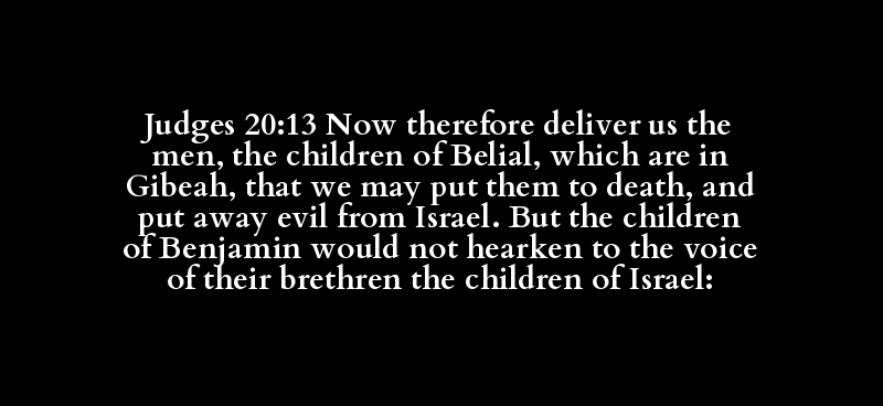 Judges 20:13 Now therefore deliver us the men, the children of Belial, which are in Gibeah, that we may put them to death, and put away evil from Israel. But the children of Benjamin would not hearken to the voice of their brethren the children of Israel: