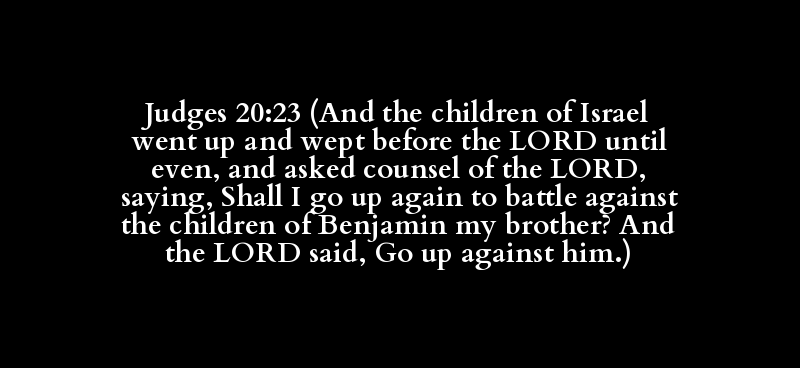 Judges 20:23 (And the children of Israel went up and wept before the LORD until even, and asked counsel of the LORD, saying, Shall I go up again to battle against the children of Benjamin my brother? And the LORD said, Go up against him.)