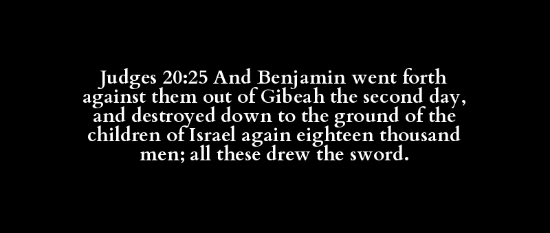 Judges 20:25 And Benjamin went forth against them out of Gibeah the second day, and destroyed down to the ground of the children of Israel again eighteen thousand men; all these drew the sword.