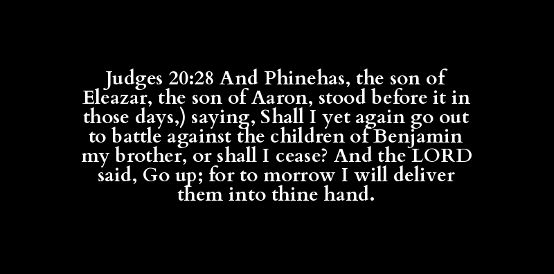Judges 20:28 And Phinehas, the son of Eleazar, the son of Aaron, stood before it in those days,) saying, Shall I yet again go out to battle against the children of Benjamin my brother, or shall I cease? And the LORD said, Go up; for to morrow I will deliver them into thine hand.