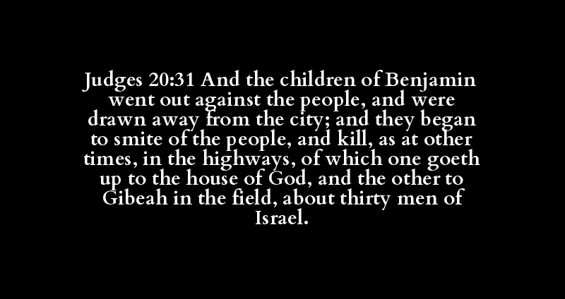 Judges 20:31 And the children of Benjamin went out against the people, and were drawn away from the city; and they began to smite of the people, and kill, as at other times, in the highways, of which one goeth up to the house of God, and the other to Gibeah in the field, about thirty men of Israel.