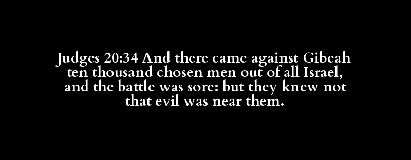 Judges 20:34 And there came against Gibeah ten thousand chosen men out of all Israel, and the battle was sore: but they knew not that evil was near them.