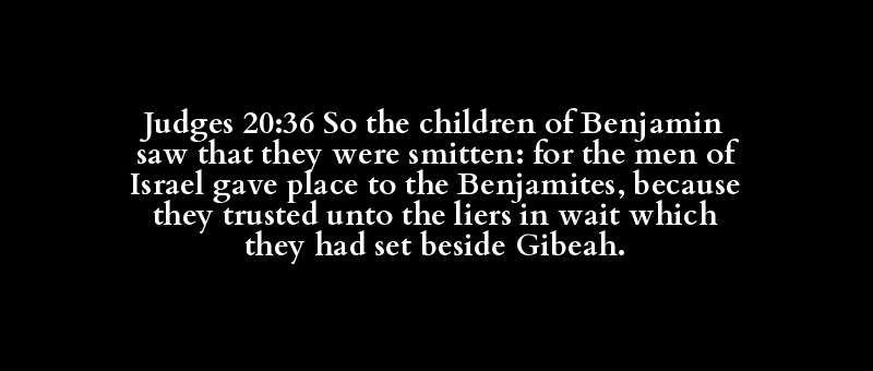 Judges 20:36 So the children of Benjamin saw that they were smitten: for the men of Israel gave place to the Benjamites, because they trusted unto the liers in wait which they had set beside Gibeah.