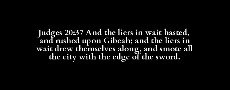 Judges 20:37 And the liers in wait hasted, and rushed upon Gibeah; and the liers in wait drew themselves along, and smote all the city with the edge of the sword.
