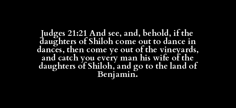 Judges 21:21 And see, and, behold, if the daughters of Shiloh come out to dance in dances, then come ye out of the vineyards, and catch you every man his wife of the daughters of Shiloh, and go to the land of Benjamin.
