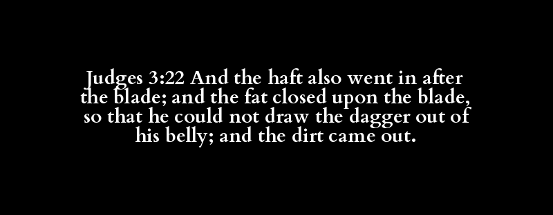 Judges 3:22 And the haft also went in after the blade; and the fat closed upon the blade, so that he could not draw the dagger out of his belly; and the dirt came out.