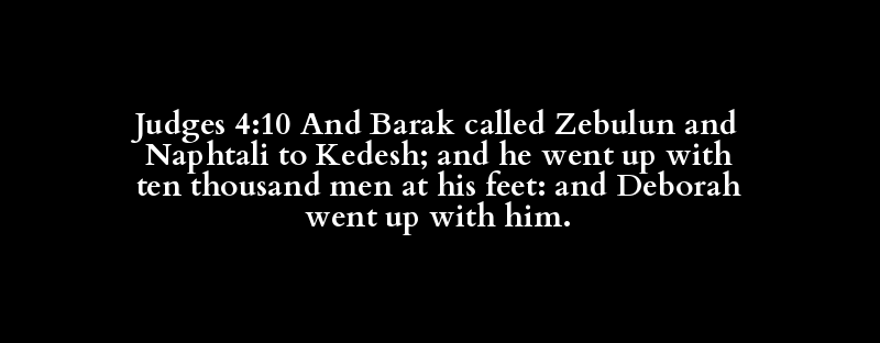 Judges 4:10 And Barak called Zebulun and Naphtali to Kedesh; and he went up with ten thousand men at his feet: and Deborah went up with him.