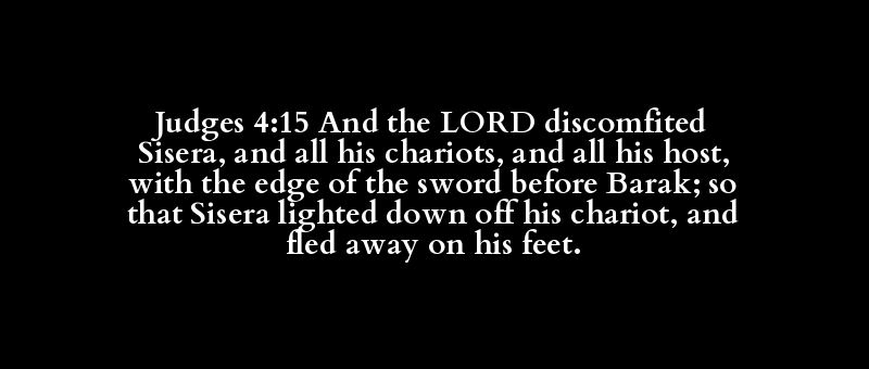 Judges 4:15 And the LORD discomfited Sisera, and all his chariots, and all his host, with the edge of the sword before Barak; so that Sisera lighted down off his chariot, and fled away on his feet.
