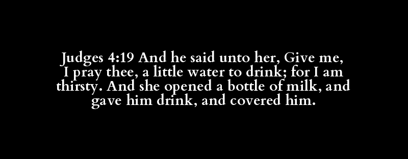 Judges 4:19 And he said unto her, Give me, I pray thee, a little water to drink; for I am thirsty. And she opened a bottle of milk, and gave him drink, and covered him.
