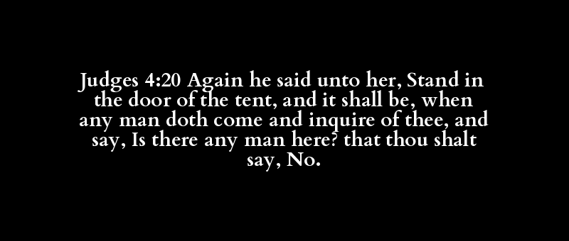 Judges 4:20 Again he said unto her, Stand in the door of the tent, and it shall be, when any man doth come and inquire of thee, and say, Is there any man here? that thou shalt say, No.