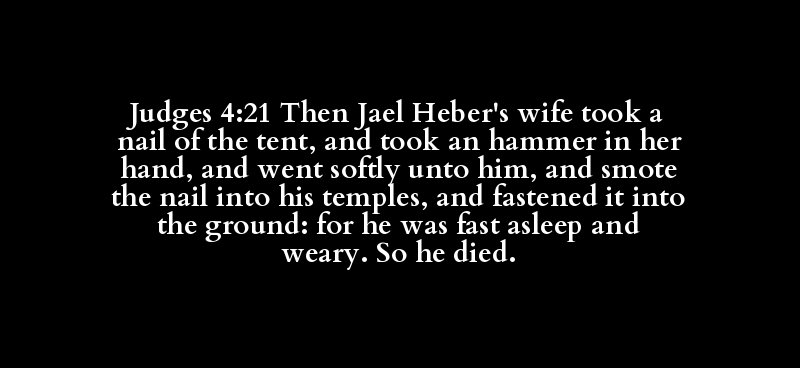 Judges 4:21 Then Jael Heber's wife took a nail of the tent, and took an hammer in her hand, and went softly unto him, and smote the nail into his temples, and fastened it into the ground: for he was fast asleep and weary. So he died.
