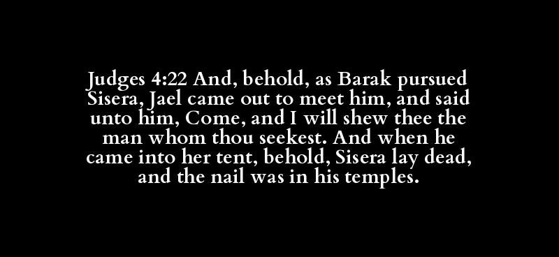 Judges 4:22 And, behold, as Barak pursued Sisera, Jael came out to meet him, and said unto him, Come, and I will shew thee the man whom thou seekest. And when he came into her tent, behold, Sisera lay dead, and the nail was in his temples.