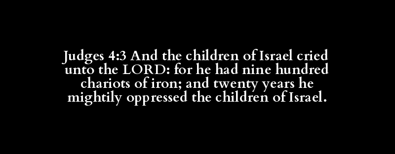 Judges 4:3 And the children of Israel cried unto the LORD: for he had nine hundred chariots of iron; and twenty years he mightily oppressed the children of Israel.