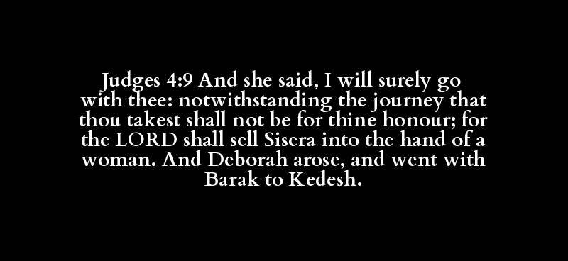 Judges 4:9 And she said, I will surely go with thee: notwithstanding the journey that thou takest shall not be for thine honour; for the LORD shall sell Sisera into the hand of a woman. And Deborah arose, and went with Barak to Kedesh.