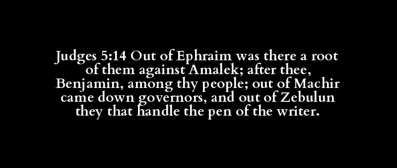 Judges 5:14 Out of Ephraim was there a root of them against Amalek; after thee, Benjamin, among thy people; out of Machir came down governors, and out of Zebulun they that handle the pen of the writer.