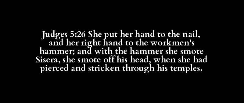 Judges 5:26 She put her hand to the nail, and her right hand to the workmen's hammer; and with the hammer she smote Sisera, she smote off his head, when she had pierced and stricken through his temples.