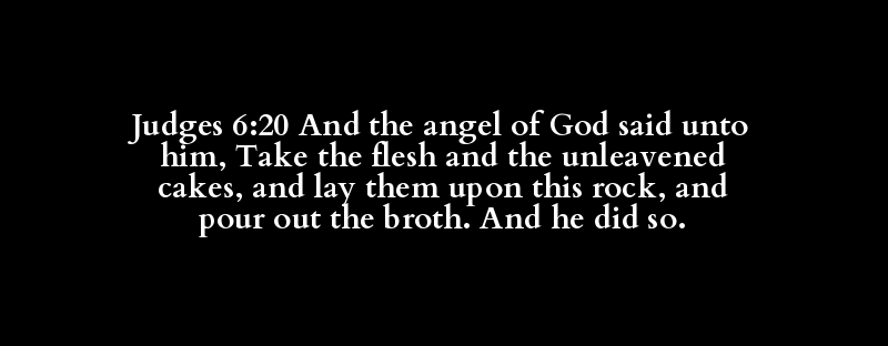 Judges 6:20 And the angel of God said unto him, Take the flesh and the unleavened cakes, and lay them upon this rock, and pour out the broth. And he did so.