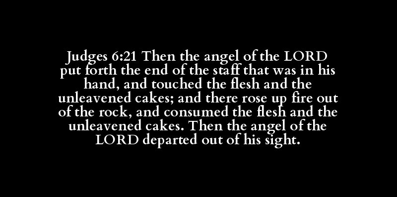 Judges 6:21 Then the angel of the LORD put forth the end of the staff that was in his hand, and touched the flesh and the unleavened cakes; and there rose up fire out of the rock, and consumed the flesh and the unleavened cakes. Then the angel of the LORD departed out of his sight.