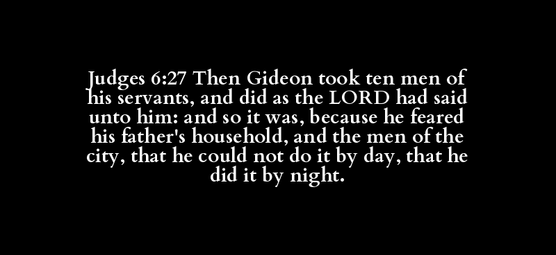 Judges 6:27 Then Gideon took ten men of his servants, and did as the LORD had said unto him: and so it was, because he feared his father's household, and the men of the city, that he could not do it by day, that he did it by night.