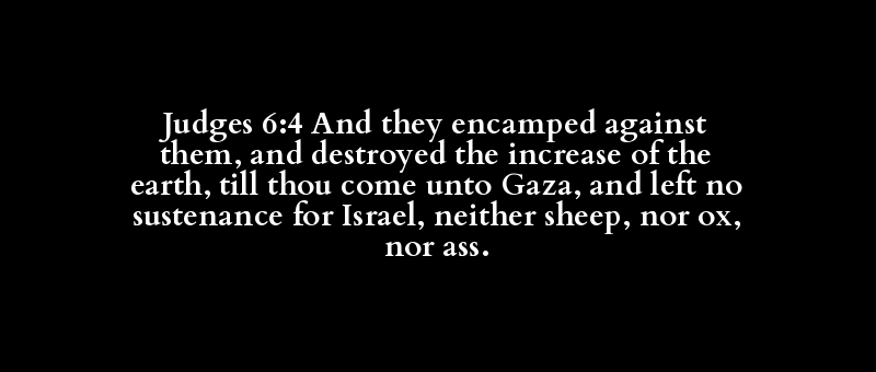 Judges 6:4 And they encamped against them, and destroyed the increase of the earth, till thou come unto Gaza, and left no sustenance for Israel, neither sheep, nor ox, nor ass.