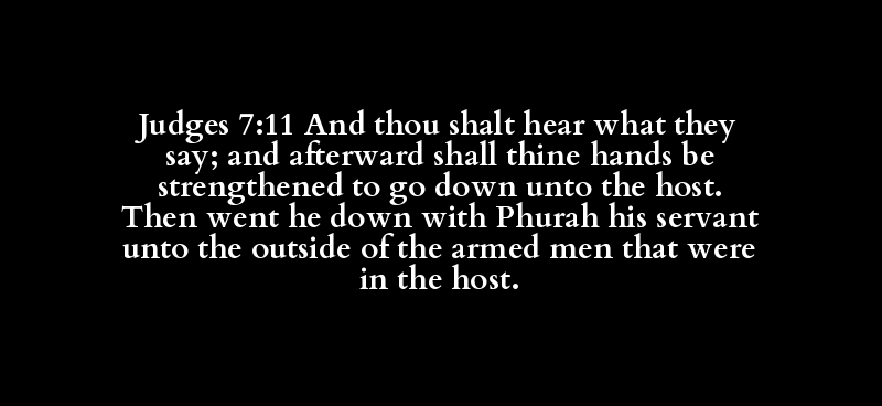 Judges 7:11 And thou shalt hear what they say; and afterward shall thine hands be strengthened to go down unto the host. Then went he down with Phurah his servant unto the outside of the armed men that were in the host.