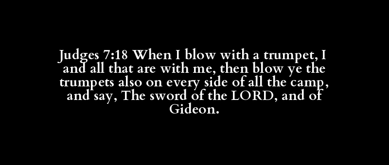 Judges 7:18 When I blow with a trumpet, I and all that are with me, then blow ye the trumpets also on every side of all the camp, and say, The sword of the LORD, and of Gideon.