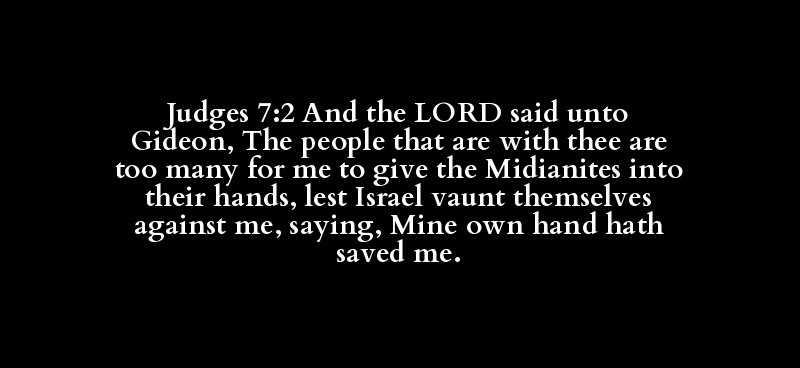 Judges 7:2 And the LORD said unto Gideon, The people that are with thee are too many for me to give the Midianites into their hands, lest Israel vaunt themselves against me, saying, Mine own hand hath saved me.