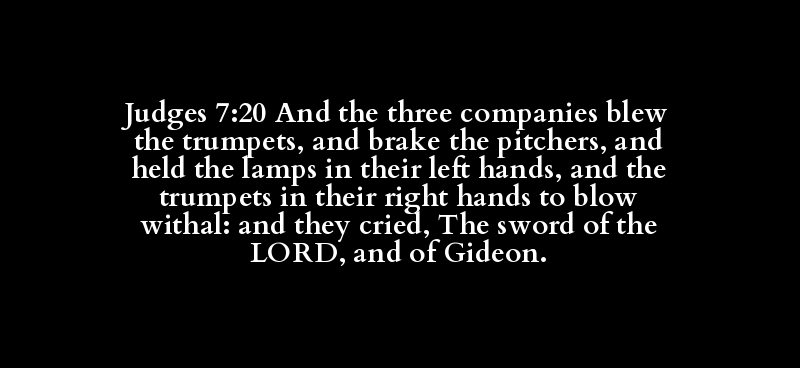 Judges 7:20 And the three companies blew the trumpets, and brake the pitchers, and held the lamps in their left hands, and the trumpets in their right hands to blow withal: and they cried, The sword of the LORD, and of Gideon.