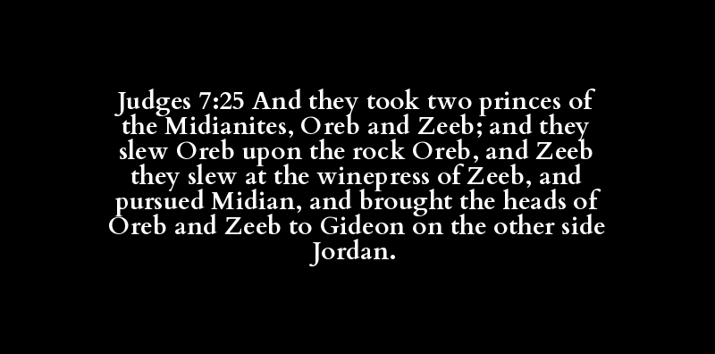 Judges 7:25 And they took two princes of the Midianites, Oreb and Zeeb; and they slew Oreb upon the rock Oreb, and Zeeb they slew at the winepress of Zeeb, and pursued Midian, and brought the heads of Oreb and Zeeb to Gideon on the other side Jordan.