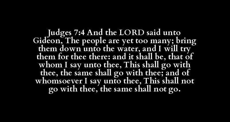 Judges 7:4 And the LORD said unto Gideon, The people are yet too many; bring them down unto the water, and I will try them for thee there: and it shall be, that of whom I say unto thee, This shall go with thee, the same shall go with thee; and of whomsoever I say unto thee, This shall not go with thee, the same shall not go.