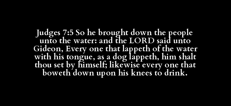 Judges 7:5 So he brought down the people unto the water: and the LORD said unto Gideon, Every one that lappeth of the water with his tongue, as a dog lappeth, him shalt thou set by himself; likewise every one that boweth down upon his knees to drink.