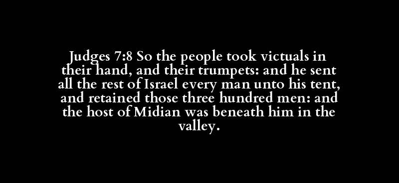 Judges 7:8 So the people took victuals in their hand, and their trumpets: and he sent all the rest of Israel every man unto his tent, and retained those three hundred men: and the host of Midian was beneath him in the valley.
