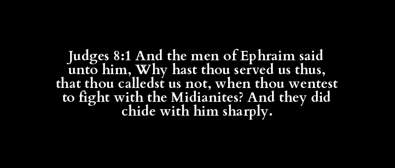 Judges 8:1 And the men of Ephraim said unto him, Why hast thou served us thus, that thou calledst us not, when thou wentest to fight with the Midianites? And they did chide with him sharply.