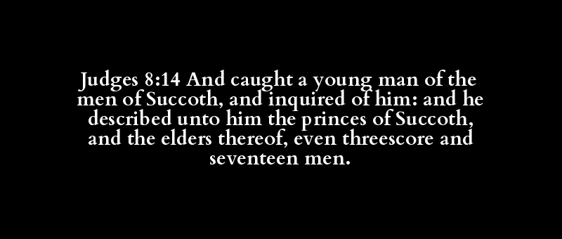 Judges 8:14 And caught a young man of the men of Succoth, and inquired of him: and he described unto him the princes of Succoth, and the elders thereof, even threescore and seventeen men.